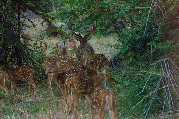 Complete family of Spotted Deer. Don’t miss the alpha male watching over his family.