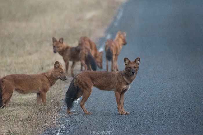 All safari jeeps wait to see the pack of pooping Dhols on the road
