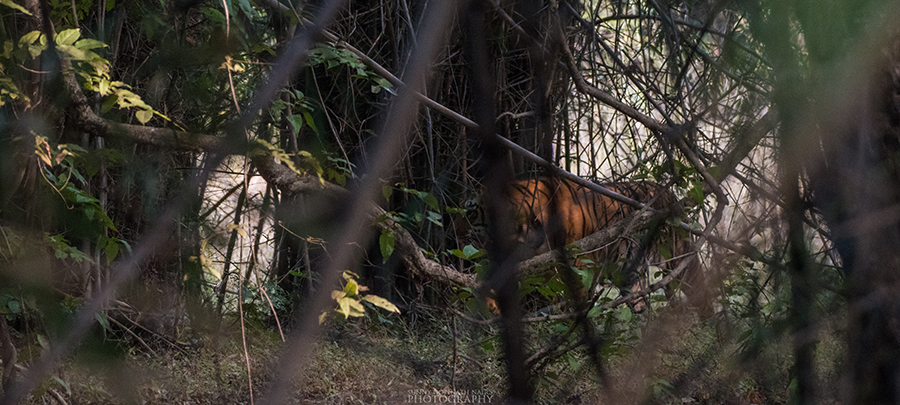 We quickly aimed our cameras to capture the big cat. Unfortunately, we did not get the shots we desired. But we kept looking at it enjoying its magnificent presence before it disappeared into the dense forest. This was my life’s first tiger spotting in the wild (sort off), and it was WILD!