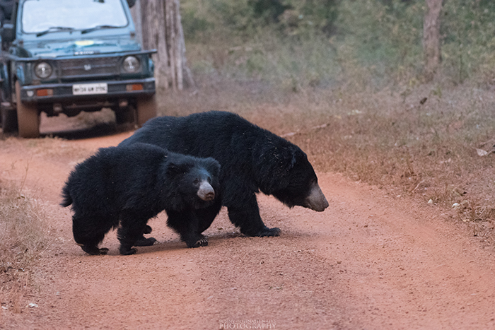 Right before sundown, we revisited the watering hole where the guide had first taken us hoping to spot the tiger, we were welcomed by a traffic jam on the dirt track. There was a loud rustle in the bamboo forest lining the sides of the dirt track. We could here whatever was making the rustling sound was approaching our jeep slowly. We were sure it was not a cat as they are never so loud while they walk. Maybe Gaur? perhaps. After 15 mins of suspense and rustling growing louder and louder, one cautious snout poked out of the trees followed by a curios junior snout. Soon with a lot of encouragement mamma Sloth bear was able tug the baby sloth bear across the pathway right in front of our jeep. Shutterbugs clicking away the cute duo. A rare sighting again of ‘Baloo’ from the Jungle book.